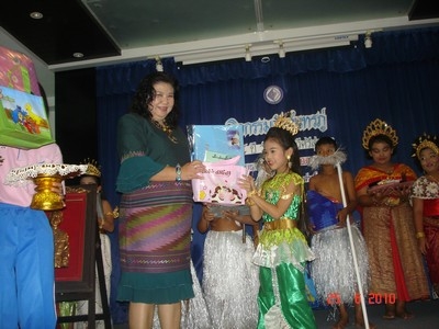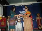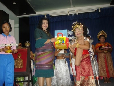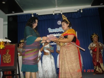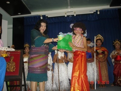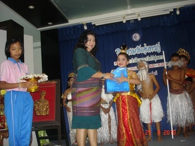 ผู้อำนวยการโรงเรียน มอบของรางวัลให้กับผู้ที่ชนะเลิศการประกวดตัวละครในกิจกรรมวันสุนทรภู่