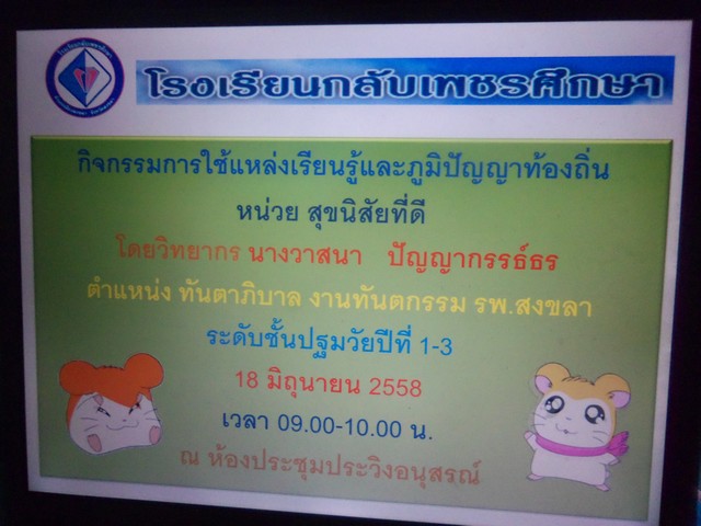 การใช้แหล่งเรียนรู้และภูมิปัญญาท้องถิ่น หน่วยสุขนิสัยที่ดี โดยวิทยากร นางวาสนา ปัญญากรรธ์ธร ตำแหน่ง ทันตาภิบาล โรงพยาบาลสงขลา ระดับชั้นปฐมวัยปีที่ 3